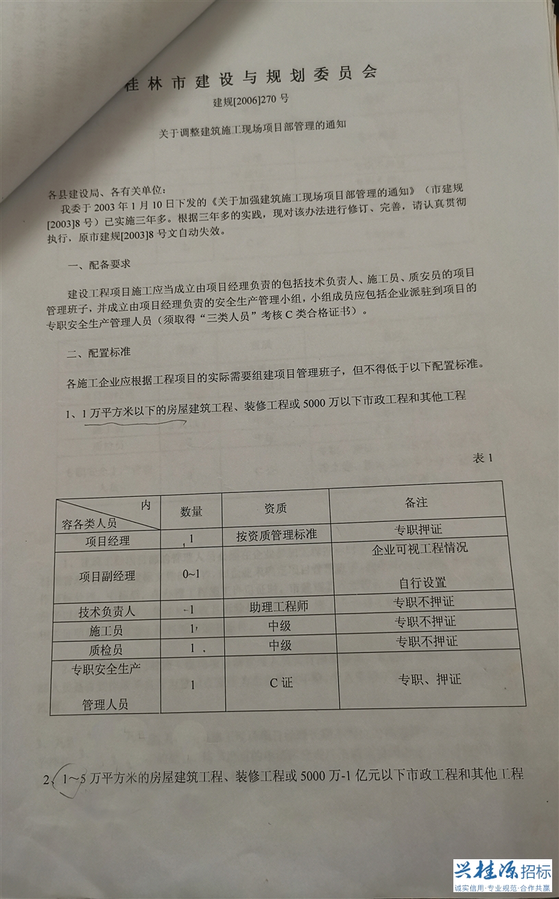 3、桂林建設(shè)與規(guī)劃委員會建規(guī)【2006】270號《關(guān)于調(diào)整建筑施工現(xiàn)場項目部管理的通知》詳見公告附件1。